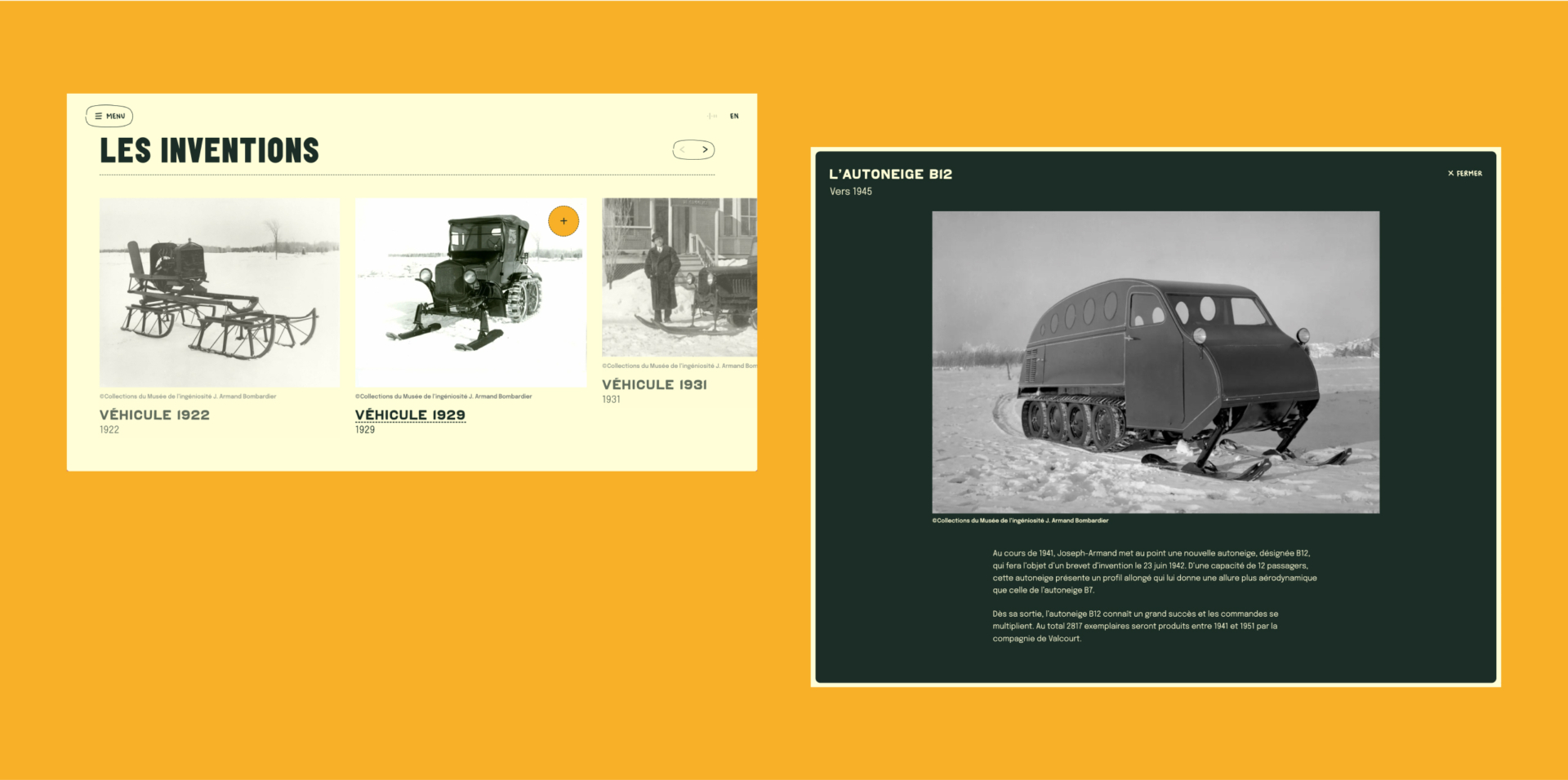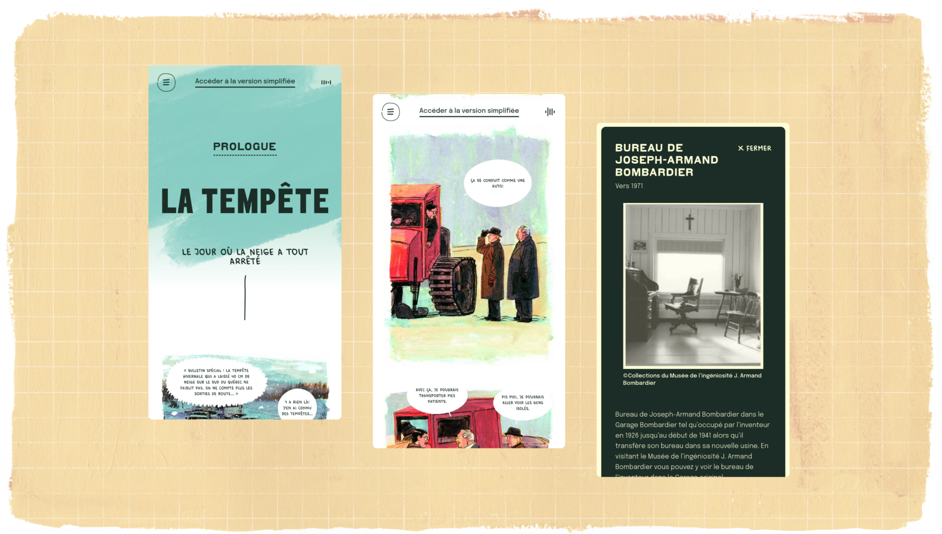 Une expérience immersive qui fusionne bande dessinée et interactivité, nous transportant au cœur de l’histoire fascinante de Joseph-Armand Bombardier, l’inventeur de l’autoneige. À travers des animations, des illustrations dessinées à la main et une ambiance musicale envoûtante, plongez dans l’univers du précurseur du Skidoo.